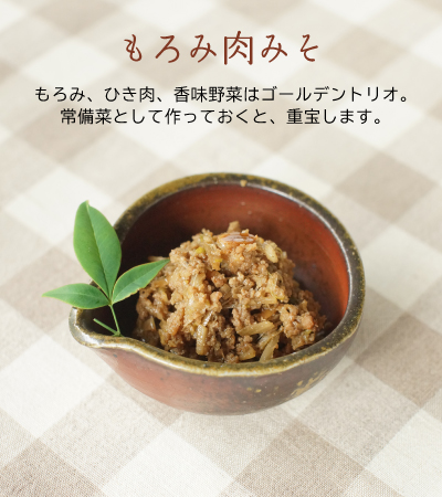 もろみ肉みそ 材料 ひき肉 (200g)・もろみ 60g・白ネギ 1本(100g)・生姜 1かけ(30g)・オリーブオイル 大さじ1/2・酢 大さじ1