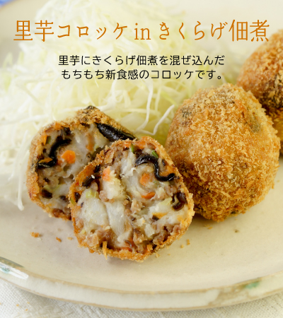 里芋コロッケ in きくらげ佃煮 材料(3〜4人分) きくらげ佃煮 1/2袋(約50g)・里芋 中サイズ6個(約500g)・合挽き肉 120g・白ネギ 1本(100g)※青い部分も使う。・人参 50g・バター 10g・小麦粉・溶き卵・パン粉 適宜・キャベツの千切り 適宜